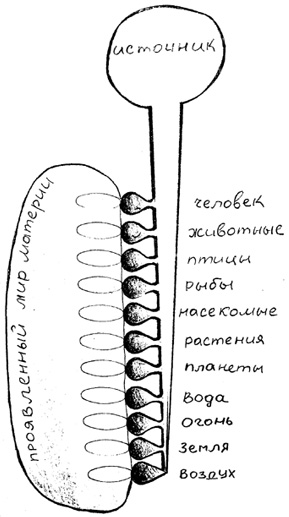 Данная схема показывает расположение отдельных миров, каждый из которых подразделяется на личные миры, и те, в свою очередь имеют свой выход в мир материи. В материю попадают все создания из личных миров, начиная с «воздуха», кончая «человеком».