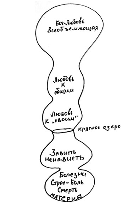 Человеческое сознание может подниматься «по хвосту» своего дракона и на различных уровнях опускаться в другие миры (это и животные и стихии ...). Взаимодействие и взаимопонимание на уровне всеобщего проявления в материи (нулевой уровень) происходит очень тяжело, почти не происходит совсем. Чаще всего происходит взаимодействие до «круглого озера». Все, что происходит выше глади озера между сознаниями - можно уже называть любовью.